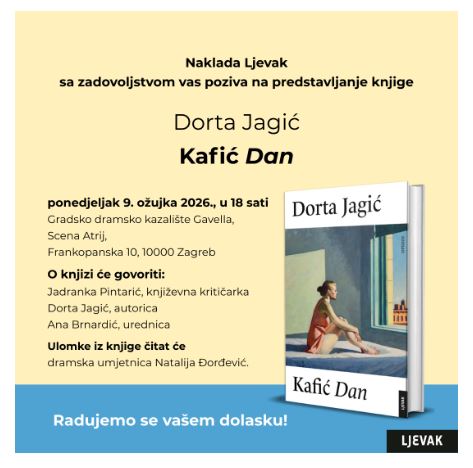 O knjizi će govoriti autorica Dorta Jagić, književna kritičarka Jadranka Pintarić i urednica Ana Brnardić. Ulomke iz knjige čitat će dramska umjetnica Natalija Đorđević.
