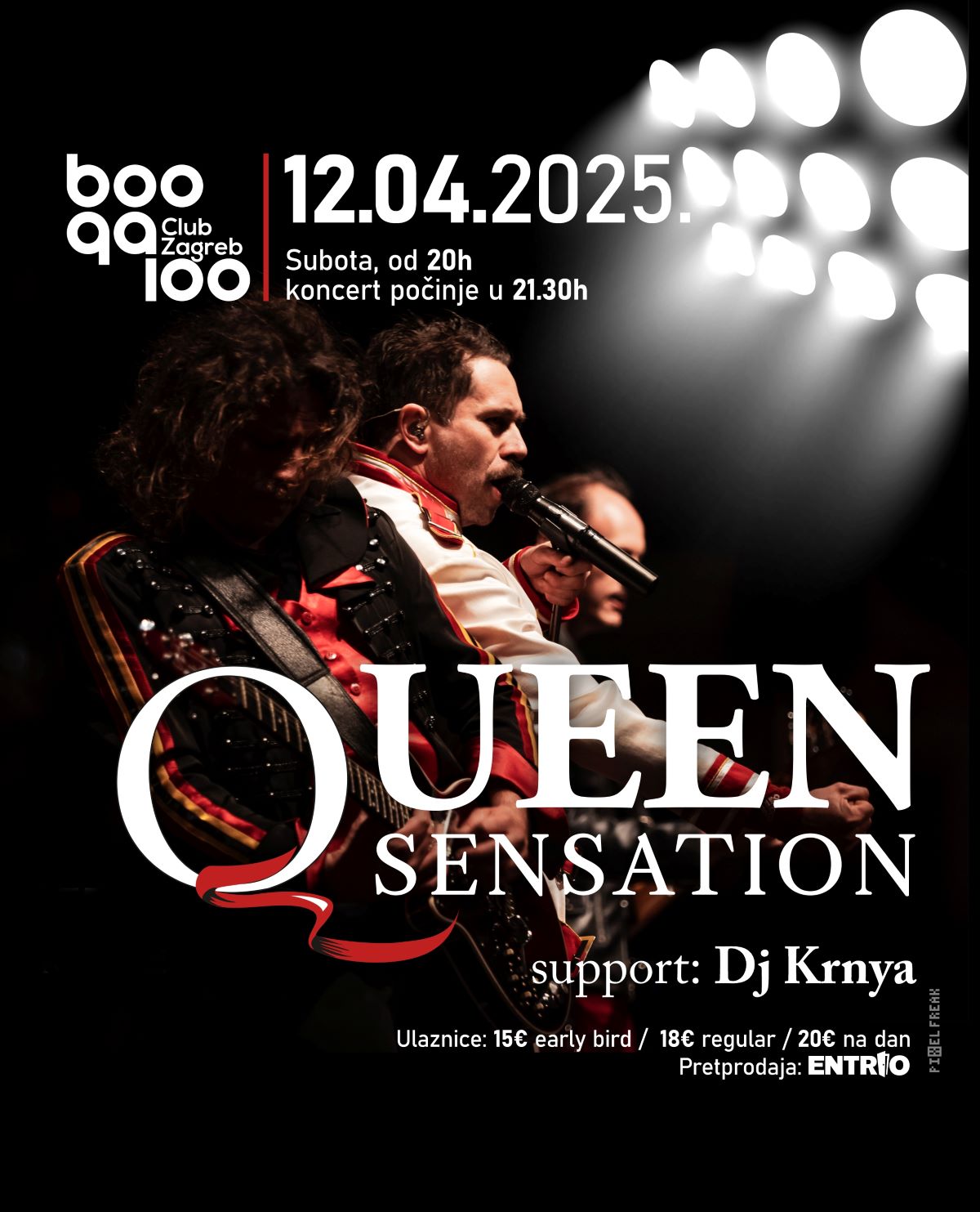 Dugoiščekivani koncert najboljeg europskog Queen tribute benda, koji se krije iza imena QUEEN SENSATION, dogodit će se u subotu, 12. travnja u Boogaloou. Za dobar štimung prije i nakon koncerta zadužen će biti DJ Krnyja. Early bird ulaznice mogu se kupiti po cijeni od 15 eura do isteka kontingenta ili najkasnije do 1. ožujka. Pretprodajne ulaznice po cijeni od 18 eura mogu se kupiti preko sustava Entrio i na njihovim prodajnim mjestima, a na ulazu će koštati 20 eura.