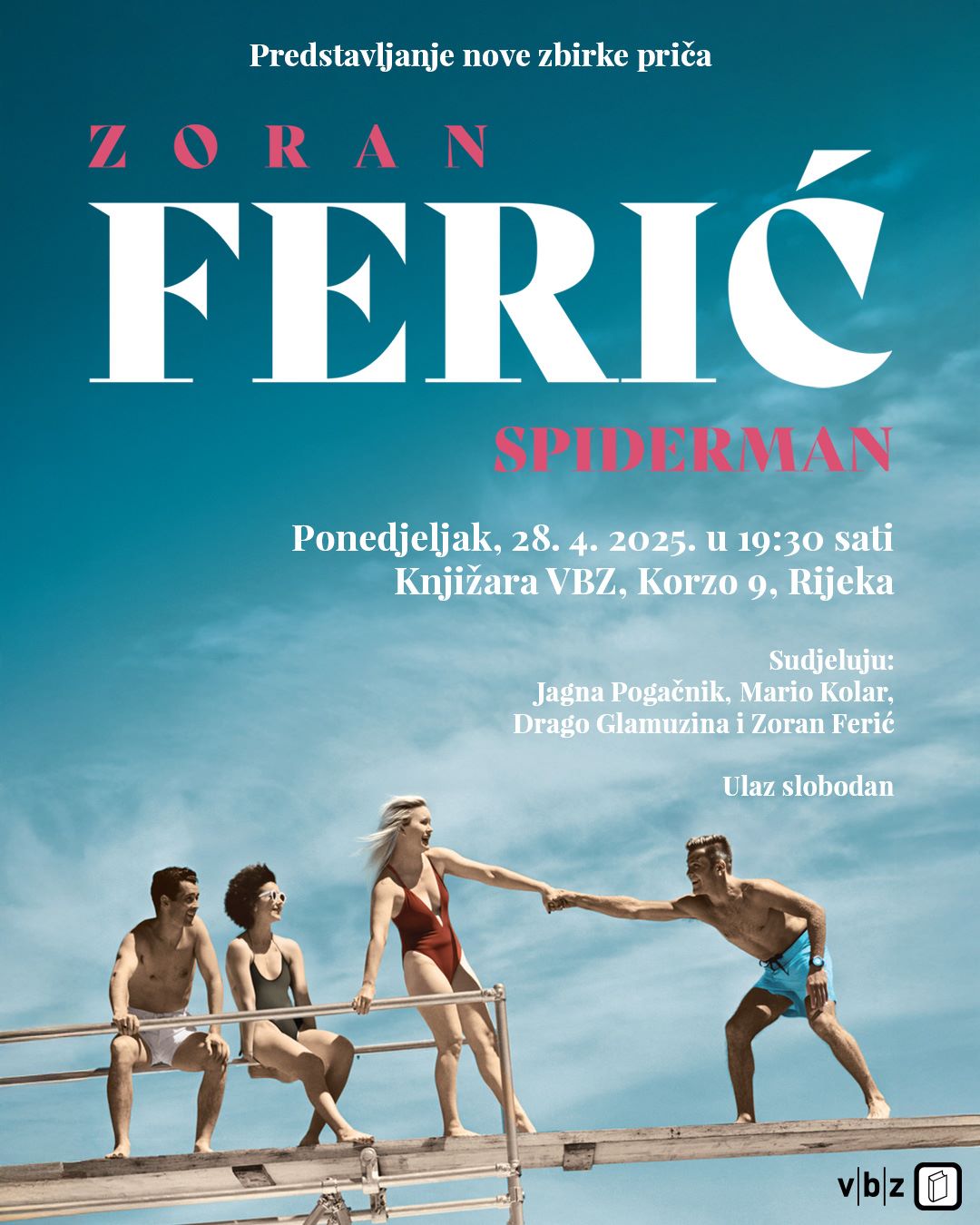 V.B.Z. vas poziva na predstavljanje nove knjige Zorana Ferića – zbirke priča Spiderman, koje će se održati u ponedjeljak 28. travnja 2025. u 19.30 sati u SRCU nove riječke V.B.Z.-ove knjižare na Korzu 9!
