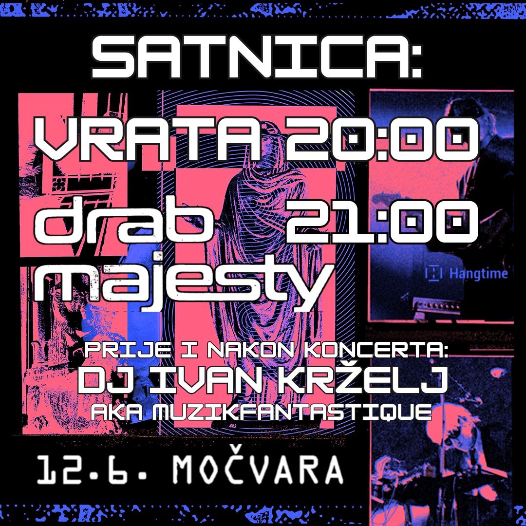 Dugoiščekivani koncert američkog mračnog dua Drab Majesty konačno će se dogoditi ovaj četvrtak (12.6.) u Močvari, a ovo će im biti jedini koncert u regiji. Prije i nakon njihovog nastupa publiku će zagrijati i razveseliti kultni DJ Ivan Krželj aka musikfantastique. Early bird ulaznice su rasprodane. Pretprodajna cijena ulaznice je 25 eura i mogu se kupiti preko Hangtime weba, a na dan će koštati 29 eura. Ulaznice: https://bit.ly/4hTWMJs