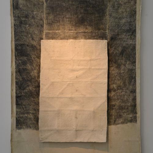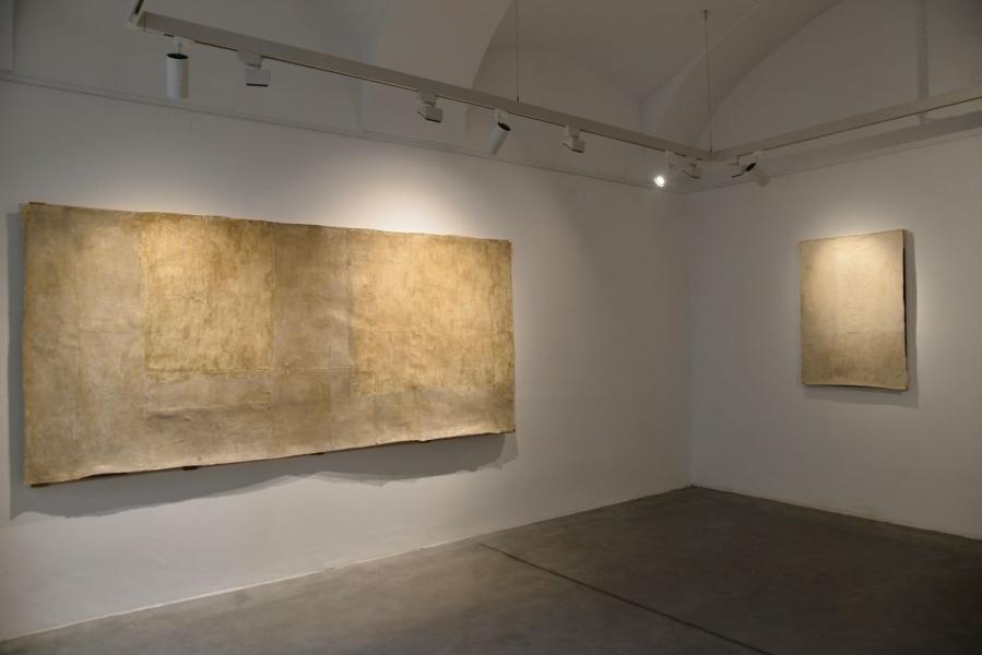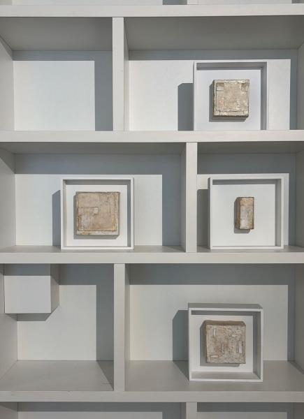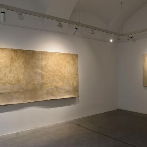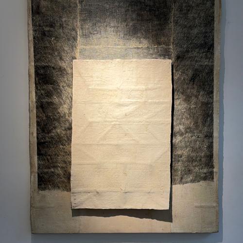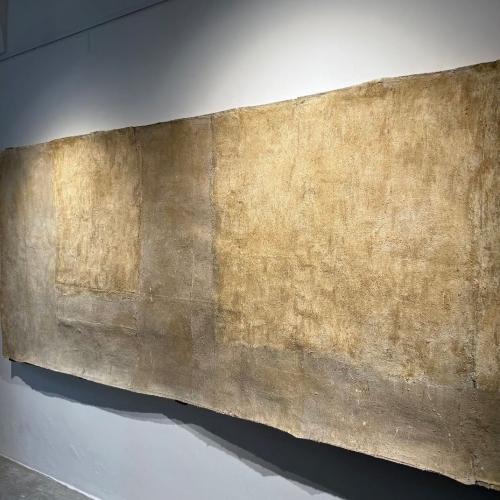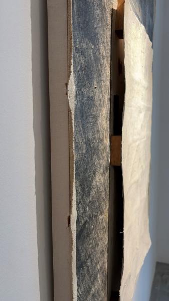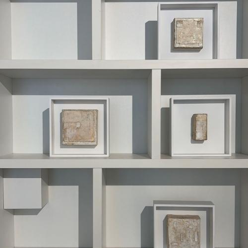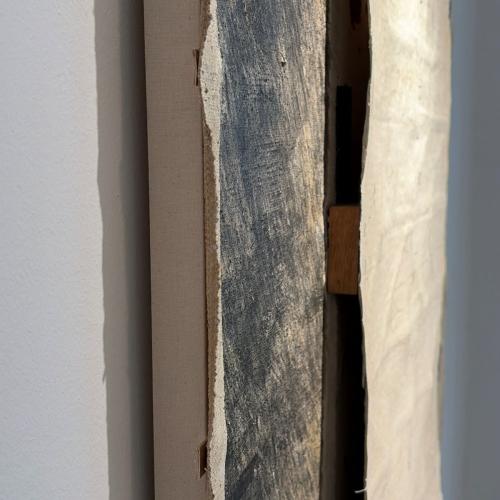 U monumentalnim slikama-objektima otvara sasvim drugi svijet: drveni distanceri, mineralni slojevi, hrapave površine — sve to stvara dubinu koju ne vidimo odmah, nego je naslućujemo tek kad joj priđemo bliže. Kao da se u unutrašnjosti svakog rada odvija nešto tiho, nepoznato, ali prisutno.