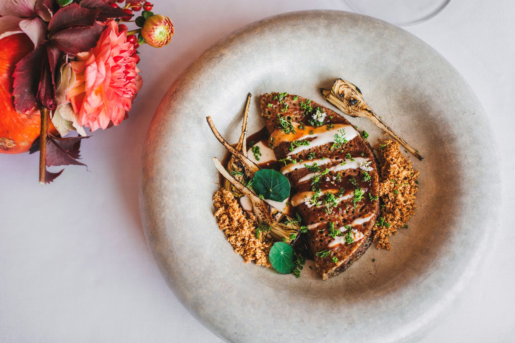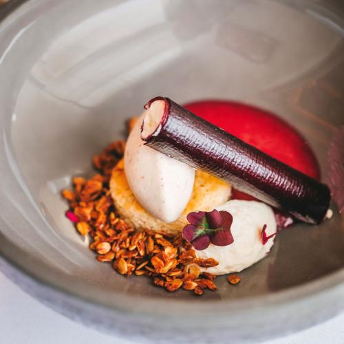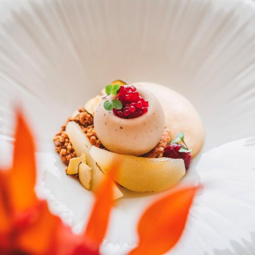 Kamenica, kavijar, karamelizirane čičoke, prženi lješnjak, ledeni prah od guščje jetre, celer kuhan u portu, aromatične lisičarke, dimljene dagnje, karamelizirana cvjetača, velouté od paljenih pinjola, njoki od ličke base, fermentirana crna leća, smrčci kuhani u konjaku, dimljeni patlidžan, paljene shiitake, brokulini, beurre blanc od algi, ukiseljeni motar, kesten, poširana kruška, butternut biskvit – samo su neki od sastojaka koji donose bogatstvo tekstura i pozivaju na istraživanje novih okusa.