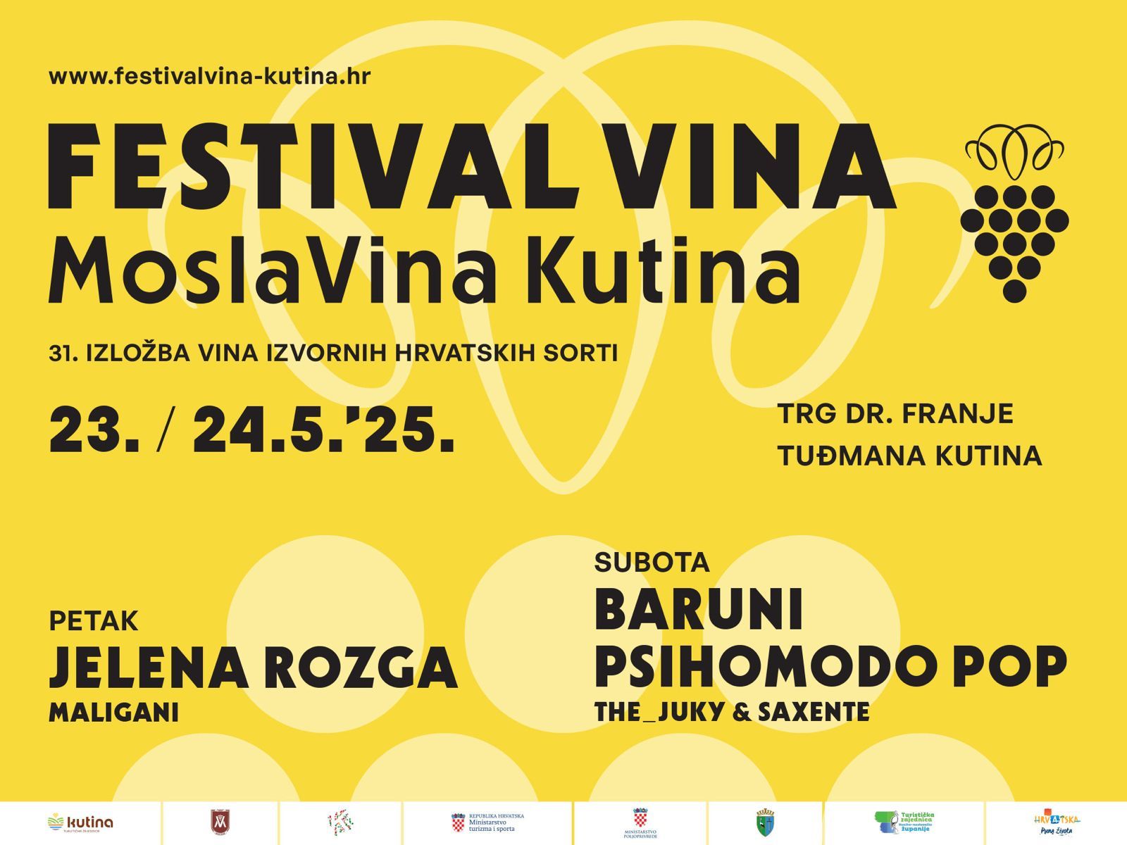 Festival MoslaVina vraća se u najveći grad vinorodne Moslavine – Kutinu! Vinska događanja, degustacije i izložba vina izvornih hrvatskih sorti u sklopu manifestacije održat će se u petak i subotu, 23. i 24. svibnja u organizaciji Turističke zajednice grada Kutine, Udruge vinogradara i voćara Moslavine ''Lujo Miklaužić'' Kutina.