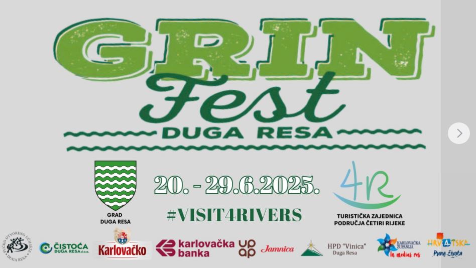 Info Festival Duga Resa GRIN FEST 2025. Ljetni festival u organizaciji Turističke zajednice područja Četiri rijeke Ne propustite priliku postati dio ljetne festivalske priče u srcu prirode! Kontakt podaci TZ područja Četiri rijeke, 20.5.2025. Podijeli Tagovi Hrvatska Duga Resa Vatra Glazba Koncert